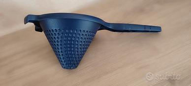 Colino a punta conica Tupperware, strumento da cucina versatile progettato per scolare, filtrare e setacciare con precisione. Capacità:Circa 500 ml. La sua particolare forma conica permette di scolare i liquidi direttamente in contenitori con imboccature strette, come caraffe o barattoli. È dotato di un manico ergonomico con foro per essere appeso e di due alette sul lato opposto che consentono di appoggiarlo saldamente sopra ciotole o pentole. Realizzato in plastica resistente di alta qualità, tipica dei prodotti Tupperware.Colore blu scuro. Nuovo. Mai utilizzato.