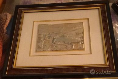 Soggetto: Suggestivo paesaggio urbano o veduta paesana, realizzato su placca di metallo a rilievo (presumibilmente argento o patinato, da verificare).