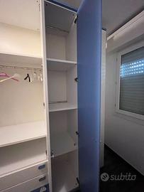 L'armadio ha una struttura con 4 ante, suddiviso in 3 blocchi (anche separabili in base alle esigente e dimensioni della stanza) in una combinazione di colori bianco e blu.