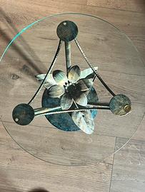 Elegante tavolino, porta piante, colonnina decorativa in ferro battuto lavorato a mano, con piano circolare in vetro.