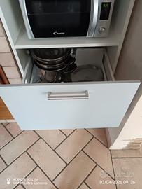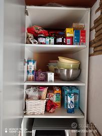 Vendo colonna dispensa Ikea, sportello con 3 ripiani, vano a giorno per microonde, 2 cassetti estraibili per pentole, colore grigio chiaro gli sportelli e la cassa del mobile bianca. Misure H 2,20 x 60 x 60, difetti come da foto, qualche scalfitura, disponibile a fine giugno. Zona Monteporzio /Finocchio