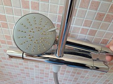 Vendo colonna doccia completa di soffione e miscelatore. Struttura in acciaio cromato, con asta regolabile e doccetta a mano inclusa. Design moderno e funzionale, facile da installare su attacchi standard.