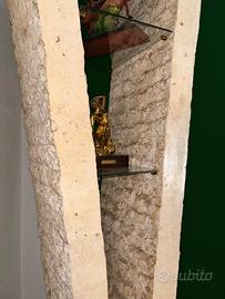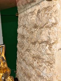 Scultorea colonna realizzata in pietra fossile naturale, lavorata artigianalmente con superficie a rilievo e texture grezza che valorizza la matericità del materiale. La struttura, slanciata e aperta verso l’alto, forma una V rovesciata di forte impatto visivo, sostenuta da una solida base arcuata che garantisce stabilità.