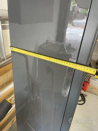 In buone condizioni presenta una leggera ammaccatura laterale e dei segni di fissaggio precedente sulla parte sinistra in basso. Compresa di mensole + 2 in vetro non presenti in foto.