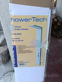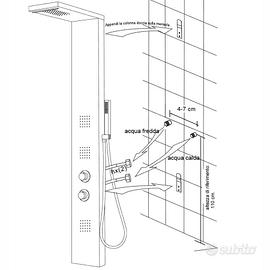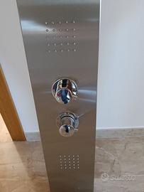 Colonna doccia con miscelatore termostatico in acciaio inox finitura spazzolata, presenta 4 funzioni selezionabili: Doccetta minimale 1 getto, Soffione doccia con anticalcare, Getto superiore effetto cascata, Getti orizzontali. Flessibile inox estensibile. Misure cm. 160x20x52