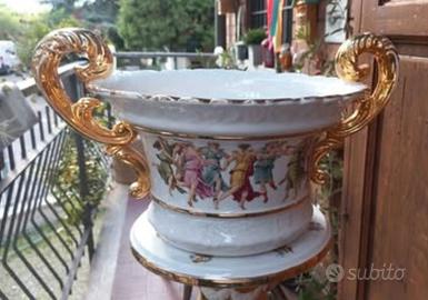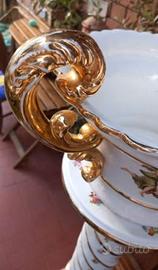 Colonna in ceramica,vintage,oro e Dei greci,marca Nuovo Trebbio,comprensiva di un vaso grande con manici oro da appoggiare sopra,ideale come vaso portafiori o piante. Stile simil Ceramica Veneta. Piccoli segni del tempo,il prezzo ne tiene già conto. Non spedisco, no perditempo.