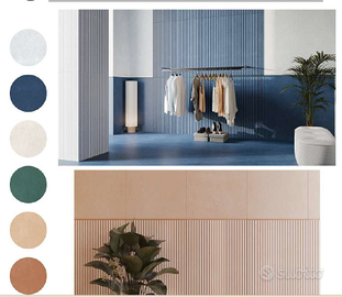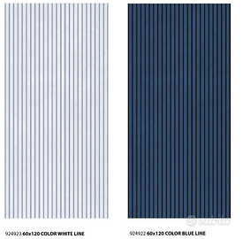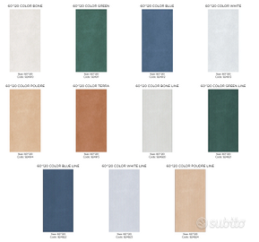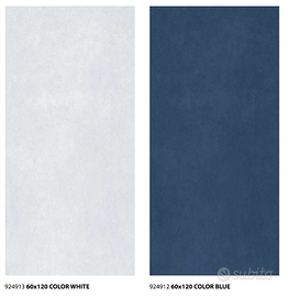 Piastrella da rivestimento e pavimento effetto canettato 60x120 cm- 8 mm pavimento, 9 mm rivestimento. Disponibile nei colori puodre, terra, blu, verde, bianco, beige chiaro. Per i rivestimenti 1,44 m2 e 2 pz per scatola, per i pavimenti 2.16 m2 e 3 pz per scatola- Minimo ordinabile 5 scatole.