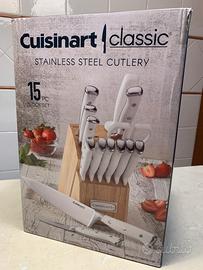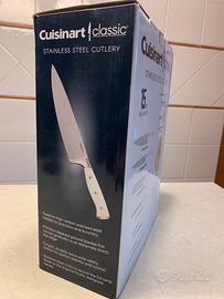 Cuisinart Set Coltelli nuovo. Venduto sui siti a E 227. Il set comprende: coltello Chef da 20,3 cm, coltello da pane di 20,3 cm, coltello per affettare 20,3 cm, coltello Santoku 17,8 cm, coltello multiuso 14 cm,