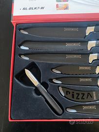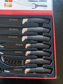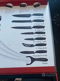 La confezione include un coltello da chef, un coltello da pane, un coltello per affettare, un coltello multiuso, un coltello per pizza, un coltello per formaggio e un pelapatate. Mai usati… ho solo usato il pelapatate che non trovo più e quindi ne ho inseriti altri tre come da foto….