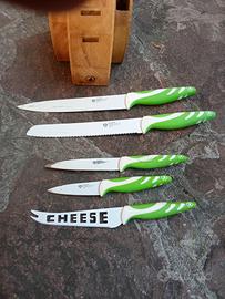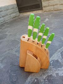 Vendo ceppo in legno in ottime condizioni con base antiscivolo ecc... già completo di 5 coltelli vari da cucina: pane, carni ed arrosti, affettati, formaggi, verdure e spelucchino... coltelli usati ma ancora funzionanti, tutto come foto