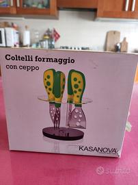 Coltelli con ceppo dal design raffinato ed elegante, adatto a qualsiasi tipo di cucina; lame ideali per il taglio di ogni tipo di formaggio. Il set è composto da un coltello per formaggi duri, un coltello per formaggio a 3 punte, un coltello a campana grande e un coltello a campana stretta. In confezione originale, mai usato.