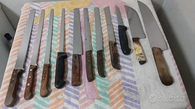 Provenienti da cessata attività di generi alimentari vendo set di 11 coltelli di vario genere e misura. 6 con manico in legno e 5 con manico in plastica. Da verificare le affilature.