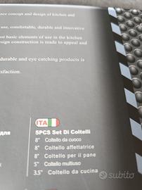 Vendo un set di 5 coltelli ROYALTY LINE, nuovi e ancora nella confezione originale. Sono di colore nero e hanno un rivestimento antiaderente. I coltelli presentano un design elegante e moderno.