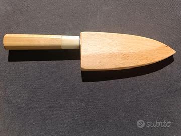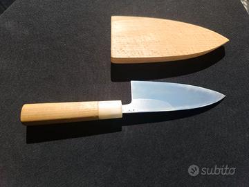 Coltello da cucina Deba in shirogami n2, durezza 61hrc lunghezza 120mm, con manico in legno di Magnolia e corno di bufalo bianco, Saya in legno foderata in pella fatto appositamente per il Coltello. Coltello proveniente dalla città di Sakai prefettura di Osaka Giappone, coltello specifico per la lavorazione del pesce di piccola/media taglia. coltello appena affilato su pietre con finitura grana 12000. Per ulteriori informazioni non fatevi problemi a contattarmi