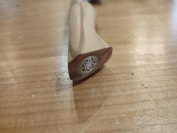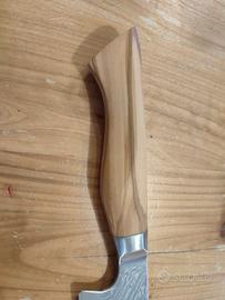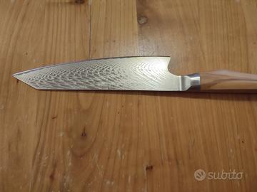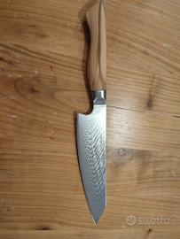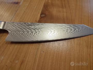 Disponibile splendido coltello professionale modello Kiritsuke, nuovo di fabbrica. Nella tradizione giapponese, questo modello è storicamente considerato il "coltello del Maestro": un tempo era l'unico utensile che solo lo Chef Capo era autorizzato a utilizzare in cucina per la sua versatilità e il prestigio che rappresenta. Caratteristiche tecniche di alto livello: Lama in Acciaio Damasco 67 Strati: Realizzata con anima ad alta durezza e 67 strati di acciaio forgiato. Il pattern damascato è unico per ogni pezzo e garantisce un'affilatura a rasoio duratura nel tempo. Design Giapponese Ibrido: Il Kiritsuke combina le funzioni del Yanagiba (per il pesce) e dell' Usuba (per le verdure). La punta a "spada" permette lavori di precisione chirurgica, rendendolo l'utensile più completo per uno chef. Manico in Vero Ulivo Massiccio: A differenza dei modelli economici, questo monta un manico in pregiato legno di ulivo naturale. Offre una presa calda, ergonomica e un contrasto estetico pazzesco con la lama damascata.