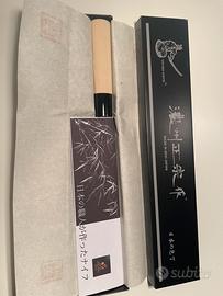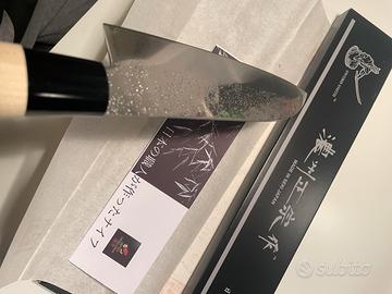 Vendesi coltello Santoku giapponese, marca SATAKE. Lama di 17 cm, impugnatura di 12 cm in legno.