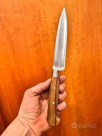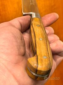 Vendo splendido coltello da cucina professionale trinciante (Chef) da 16 cm, realizzato artigianalmente dalle storiche Coltellerie F.lli Consigli di Scarperia (Firenze). Il coltello è nuovo, mai usato, un vero gioiello del "Made in Italy" forgiato secondo la tradizione secolare toscana. Caratteristiche principali: • Lama: Acciaio inox di alta qualità da 16 cm, forgiata con codolo integrale (l'acciaio attraversa tutto il manico per una robustezza e un bilanciamento superiori). • Manico: Pregiato legno di olivo toscano, caratterizzato da venature calde e uniche. Ogni pezzo è un esemplare unico. • Costruzione: Assemblato con tre rivetti in acciaio, design ergonomico e finiture di pregio. • Utilizzo: Perfetto come coltello universale da cucina (carne, verdure, affettati) o come pezzo da collezione. Condizioni: Nuovo di fabbrica. La lama è affilata a rasoio e il legno è in perfette condizioni naturali. (Nota: Eventuali piccoli segni sulla superficie sono tipici della lavorazione artigianale a mano).