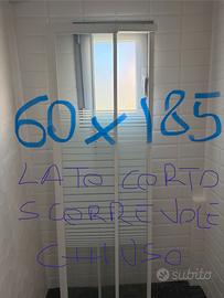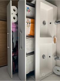 Combinazione bagno formata da bidet e wc sospesi con sedile, box doccia angolare, mobile bagno con doppio lavabo.