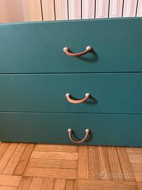 Due comodini verde oliva usati ma ancora in ortime condizioni (hanno solo qualche qualche graffietto come da foto). Meccanica perfetta. Misure diverse, stessa altezza, uno ha due cassetti l’altro 3. Maniglie in pelle. Si possono aggiungere dei piedini volendo