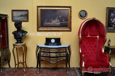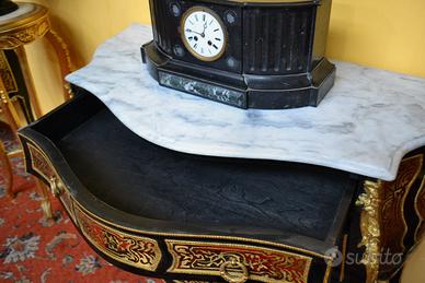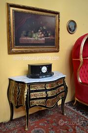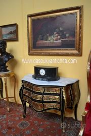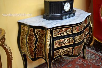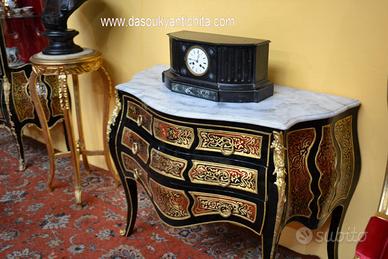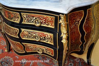 Comò stile Luigi XV Boulle , bombato su fronte e fianchi , provvisto di tre cassetti, legno ebanizzato , rifinito da elaborati intarsi a motivi vegetali in ottone.