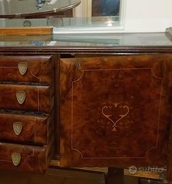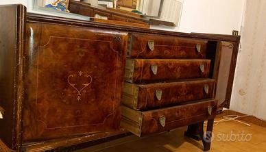 Regalo comò anni ’50 con specchiera, composto da quattro cassetti centrali e due ante laterali decorate.