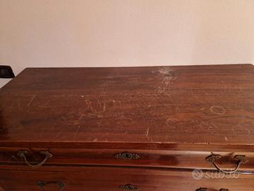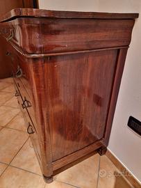 comò antico a cassetti (cassettone),di epoca fine ’800 – inizi 900 Struttura in legno massello Quattro cassetti, il primo leggermente più bombato, con maniglie in bronzo/fusione in stile Liberty o Umbertino. Piedini torniti e sagomati. Finitura a gommalacca (lucidatura tipica dell’epoca). Era un mobile da camera da letto.