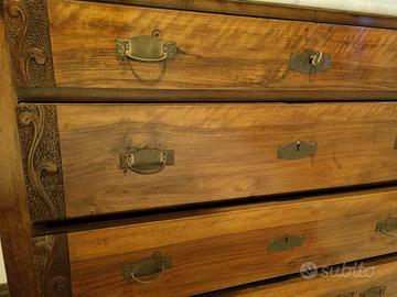 Stile: Antico con dettagli decorativi intagliati sui cassetti e sulla cornice dello specchio.