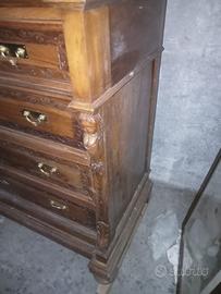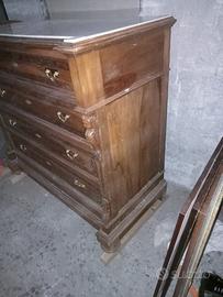 comò antico in legno pregiato caratterizzato da quattro cassetti finemente intagliati e un piano superiore in marmo bianco. le maniglie dei cassetti sono di ottone antico, i cassetti sono incastrati a coda di rondine, sono presenti ai lati dettagli decorativi.