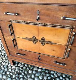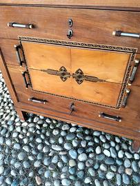 Comò antico con specchio stile Biedermeier con elegante impiallacciatura e intarsi. Questo stile diffuso all'inizio del XIX secolo, è noto per le sue linee pulite e sobrie e l'uso di ricche venature del legno. Ci sono anche i suoi due comodini. Misure comò: larghezza 102 prof.50 h.108
