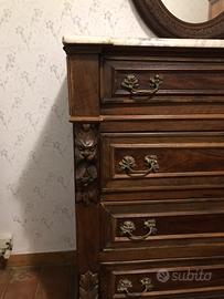 Antico comò in noce meta ‘800 origine marchegiana, con intagli a mano. Pietra in marmo originale