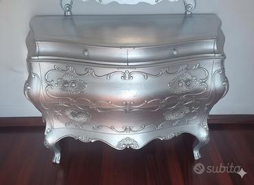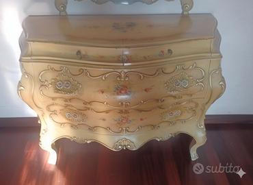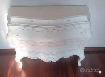Vendesi elegante comò bombato in stile classico, finitura chiara con decori floreali fatti a mano e dettagli oro. Mobile di grande impatto visivo, ideale anche per restyling moderno (nero matt o shabby).