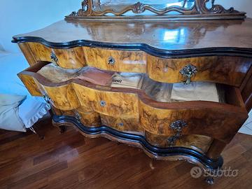 Comò bombato in stile barocco veneziano, realizzato negli anni ’50 in radica di noce con cornici in legno massello intagliato.