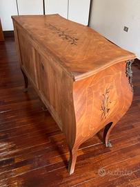 Il mobile, caratterizzato da linee mosse e bombate, presenta una raffinata impiallacciatura con intarsi decorativi geometrici e floreali, eseguiti con essenze lignee di pregio.