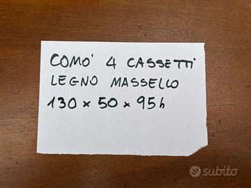 Vendo comò in legno massello con 4 ampi cassetti, ideale per camera, ingresso o soggiorno. Misure: 130×50×95h. Struttura solida, cassetti scorrevoli, ottimo stato di conservazione. Ritiro in loco. Prezzo: €250 trattabili