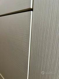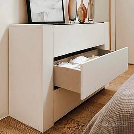 CASSETTI CAPIENTI: Tre cassetti ampi (93 x P35 x H14 cm) con apertura push-pull per una chiusura silenziosa e ammortizzata. Gli interni sono rifiniti con una elegante finitura effetto tessuto beige. Ogni cassetto ha una portata massima di 25 kg, offrendo tanto spazio per riporre stoviglie o biancheria in modo pratico e ordinato.