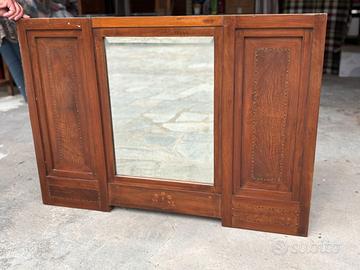 Cassettone Comò anni '50 con quattro cassetti, 2 antine laterali e una specchiera sopra. Altezza totale 1,93, larghezza 1,18, profondità del mobile 0,51. Ritiro in loco.