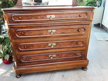 Como' Cassettone antico in noce e inserti in radica in ottime condizioni. Completo di specchio sempre antico con effetto onda. Nell'insieme molto bello. I cassetti sono rivestiti in cotone Damasco con finitura. Vendo x cambio arredamento. Misura specchio base L. 106.5 x h. 62 effetto onda. Mobile in noce e inserti in radica nei cassettoni dimensioni L.115 x P 55 x h. 97. Ritiro di persona salvo vicinanze Prschiera che potrei accordarmi x portarvelo.