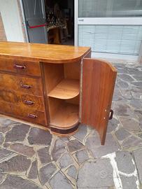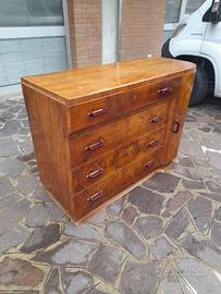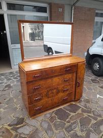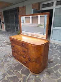 Bellissimo comò art deco in noce bionda e radica completo di specchiera, composto da 4 grandi cassetti e un vano laterale stondato chiuso da sportello, molto belle le maniglie originali dell' epoca. Richiede restauro classico, trattamento antitarlo e lucidatura , buone condizioni di conservazione originali. Posso spedire o consegnare ovunque