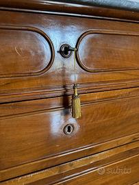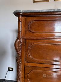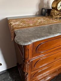 Antico cassettone caratterizzato da una struttura in legno con cassetti e un piano in marmo grigio in stile Luigi Filippo, databile alla metà del XIX secolo. Presenta quattro cassetti con decorazioni ovali e intagli elaborati sui montanti laterali. Misure 130x61 h 120