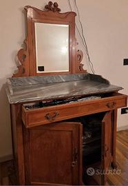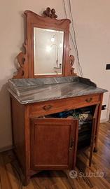 Vendo, causa trasloco, antico mobile in legno massiccio, ciliegio, con specchiera reclinabile, un cassettone, 2 ante con ripiano interno, pianale in raro marmo grigio di carrara. Datato prima metà ‘900, ottimo stato e recentemente restaurato. Misure h 160 (h specchio 75 cm), L 1.00, profondità 55 cm. Realizzo immediato.