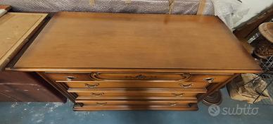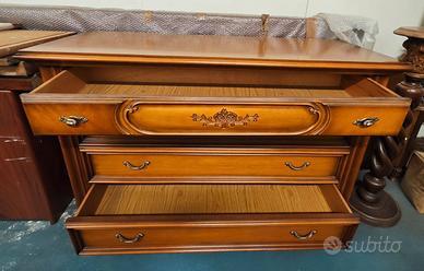 Vendesi elegante comò in legno in stile classico, ideale per camere da letto raffinate o come pezzo d'arredo per ingressi e saloni. Il mobile è solido e ben conservato. 4 ampi cassetti (di cui il primo con decorazione intagliata a rilievo). Maniglie originali in metallo brunito lavorato. Finitura: Legno con venature a vista e tonalità calda. Ritiro a Pero (Milano)