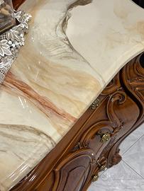 • Piano in marmo: Il top sagomato è realizzato in vero marmo pregiato, caratterizzato da eleganti venature sui toni del crema, beige e terra di Siena.