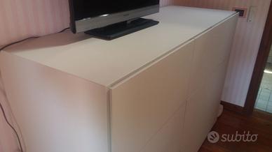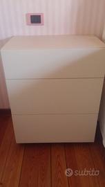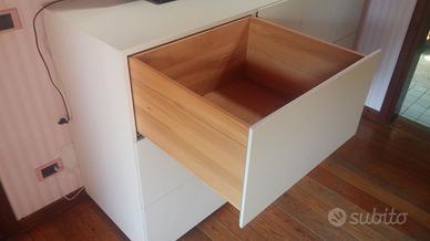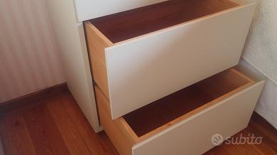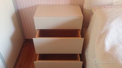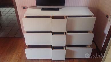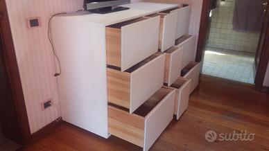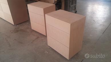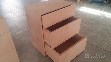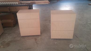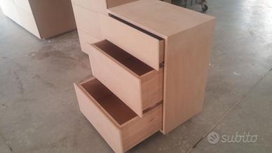 gruppo di un comò e 2 comodini costruiti in listellare ricoperto di mdf idoneo per la laccatura uniforme che è stata fata rall 9010 bianco opaco unita la struttura a 45°con misure lungh. 150 prof. 55 h 100 predisposto con 3+3 cassetti da circa 60 cm ai lati che si apriranno tramite goletta interna con profilo in alluminio unito a 45° mentre i cassetti nella parte centrale avranno lo stessa fattezza dei cassetti laterali ma si apriranno con apertura push pull a pressione dato che avremmo uno spazio/aria tutta attorno di circa 2 mm con lungh. di circa 30cm. scorreranno su guide ammortizzate in chiusura marca GRASS come pure quelli centrali anche con apertura push, interno del cassetto costruito in faggio massello con fondo da 0,8 cm in multistrato. I comodini con misure lungh. 60 prof 40 h 75 composto da 3 cassetti cadauno 2 grandi e 1 piccolo sempre con interno in faggio massello con guide ammortizzate e fresata per apertura sui 3 lati del cassetto come pure sul comò. Lo zoccolo avrà altezza di 3 cm e applicato internamente alla scocca che verrà laccato nero opaco. nascosti dietro lo zoccolo saranno gambette regolabili per mettere a bolla il tutto. costruito e venduto su commissione di conseguenza non teniamo magazzino ma essendo i diretti produttori possiamo costruirlo su misura in base alle proprie esigenze, NOI siamo i diretti costruttori li facciamo noi con le nostre mani siamo in grado di soddisfare qualsiasi richiesta che può essere su misura del cliente sia cassettiera o altro sia legno vecchio sia altro legno. il prezzo si intende franco fabbrica compreso di finitura imballo non comprendente di iva. per domande o dubbi contattateci. per noi conta dare vita al vostro sogno DIRETTAMENTE DAL PRODUTTORE. ASTENERSI RIVENDITORI E COMMERCIANTI