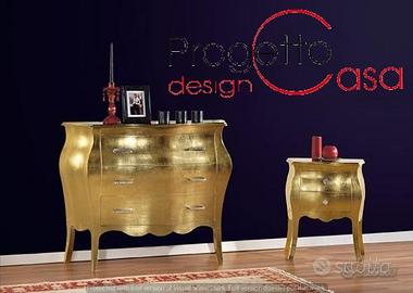 Comò bombato 3 cassetti Foglia oro Foglia argento Bianco brillante