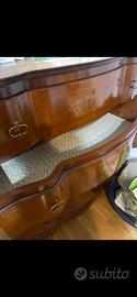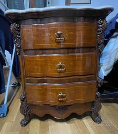 Comó con 4 cassetti di cui uno con anta a ribalta (porta oggetti). Piano in marmo. In abbinato 2 comodini. Vendibili anche separatamente (comó € 300,00 e 2 comodini € 250,00)