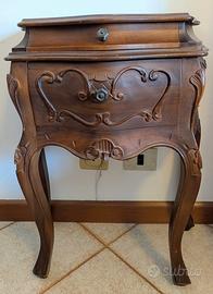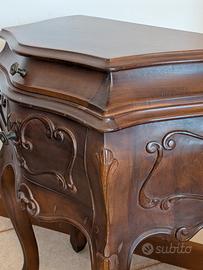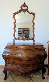 Comó da camera da letto, con ampio specchio, e set di 2 comodini abbinati. tenuti ottimamente, il comò ha una piccola macchia sul top. Il comò ha due profondi cassettoni e due cassetti piccolini, mentre i comodini hanno entrambi un cassetto più profondo e uno più piccolo. misure del comò:110cm di larghezza x 50cm di profondità x 88cm di altezza. Misura dello specchio, 130 cm di altezza x 70 cm di larghezza. Misura dei comodini: 46 cm di larghezza, 38 cm di profondità, 56 cm di altezza. legno massiccio. ritiro e trasporto a carico dell:acquirente.