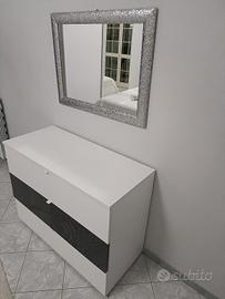 vendo comò moderno bianco con una fascia nera lucida con disegni a 3 cassetti grandi misura 105x46cm altezza 80cm più specchiera moderna contorno brillantinato argento misura 82x62cm