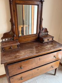Vendo comò d’epoca in legno massello con due ampi cassetti e specchiera lavorata. Struttura solida, con lievi segni d’uso compatibili con l’età del mobile. Ideale per camere da letto o ingressi in stile classico.