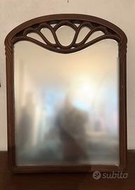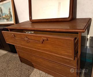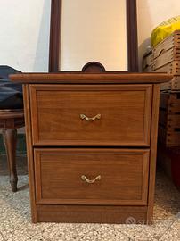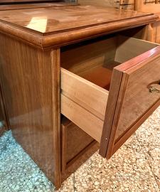 Vendo comò con specchio abbinato a due comodini, realizzati in legno massello color noce. Un set elegante e robusto, perfetto per camere da letto dallo stile classico e senza tempo. Qualità artigianale.