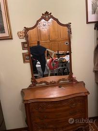 Vendo cassettiera con grande specchiera in stile classico, in legno massello con intagli decorativi che ricorda lo stile Luigi XV.